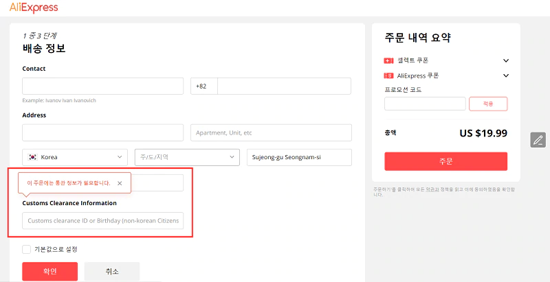 주문 과정에서 '이 주문에는 통관 정보가 필요합니다.' 라는 문구가 뜨는데 알리익스프레스 통관번호 입력 방법은 다음과 같다.